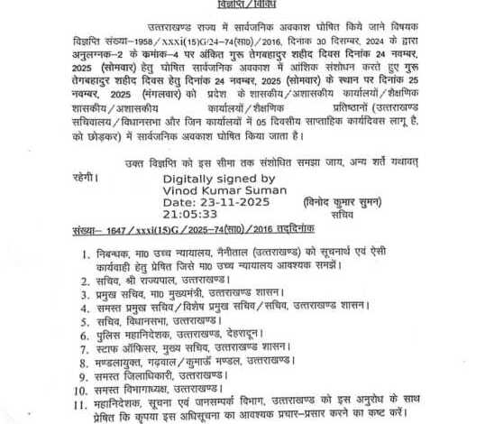 (उत्तराखण्ड सचिवालय, विधानसभा तथा 5-दिवसीय कार्य-सप्ताह वाले कार्यालयों को छोड़कर)पर लागू होगा।यह आदेश सचिव विनोद कुमार सुमन द्वारा जारी किया गया है।अब गुरु तेग बहादुर शहीद दिवस 25 नवंबर 2025 को होगा सार्वजनिक अवकाश।