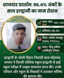 हल्द्वानी के छात्र मोहम्मद अम्मार ने हाई स्कूल में किया शानदार प्रदर्शन, 96.4% अंक हासिल..