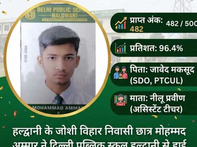 मोहम्मद अम्मार ने Delhi Public School हल्द्वानी से अपनी 10 वी की पढ़ाई पूरी की है। उनकी इस सफलता से पूरे क्षेत्र में खुशी का माहौल है और अन्य छात्रों के लिए भी प्रेरणा बनी है।